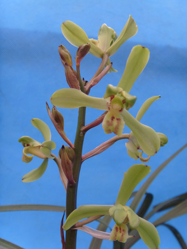 纯种蕙兰(九华兰、巴茅兰)中宽软垂叶,叶片粗糙,带齿,经脉透亮。一杆多花。色彩明艳,形态优美。浓香型。 |