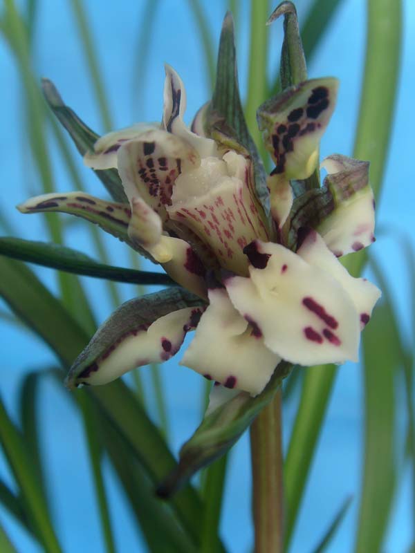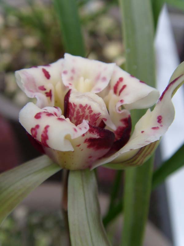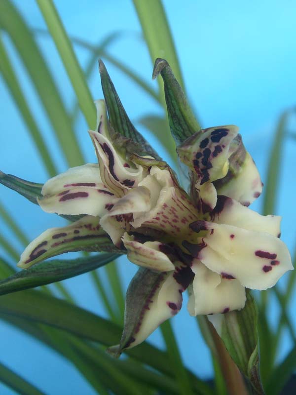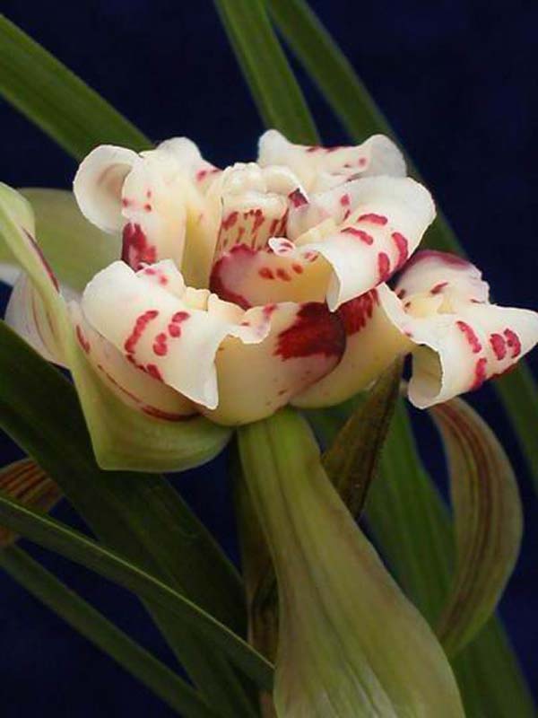 中宽软立叶,一杆一花。有时一杆开双花。形态优美,纯种春兰。浓香型。