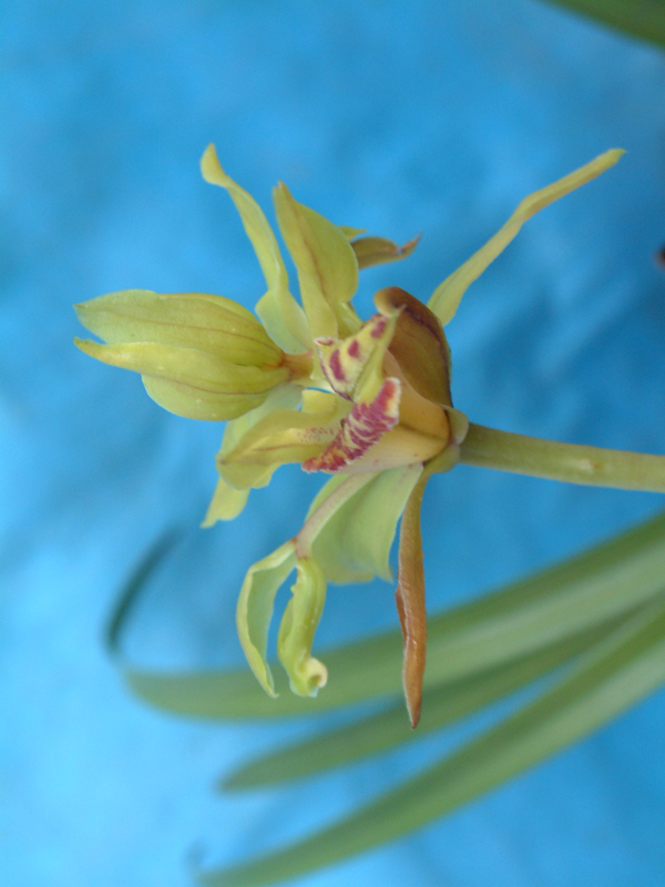 纯种蕙兰(九花兰、巴茅兰)中宽软垂叶,一片粗糙经脉透亮、带齿。一杆多花。色彩明艳,形态优美。浓香形。