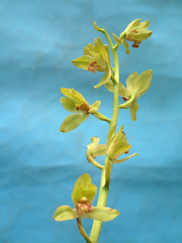纯种蕙兰(九华兰、巴茅兰)中宽软垂叶,叶片粗糙,带齿,经脉透亮。一杆多花。色彩明艳,形态优美。浓香型。 |