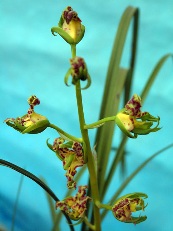 纯种蕙兰(九花兰、巴茅兰)中宽软垂叶,一片粗糙经脉透亮、带齿。一杆多花。色彩明艳,形态优美。浓香形。 |