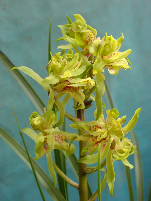 纯种蕙兰(九花兰、巴茅兰)中宽软垂叶,一片粗糙经脉透亮、带齿。一杆多花。色彩明艳,形态优美。浓香形。