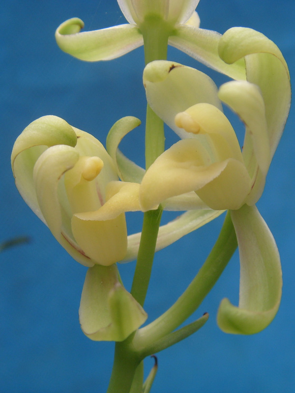 此花外瓣绿黄色的梅形水仙素,(称之为水仙瓣,是因其花瓣比较长,不太像梅瓣。标准的梅瓣短宽圆端庄),有时主瓣中间的筋脉有杠带色的彩,瓣宽长。捧瓣乳化起兜。如意翘舌素(无胎印)。五瓣分巢。是夏兰类不可多得的梅形水仙瓣素。在野生资源面临灭绝的今天,该品种值得兰友关注,是收藏及投资的新品种。至今30苗左右。 |