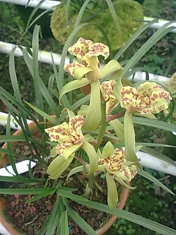 纯种蕙兰(九花兰、巴茅兰)中宽软垂叶,一片粗糙经脉透亮、带齿。一杆多花。色彩明艳,形态优美。浓香形。 |