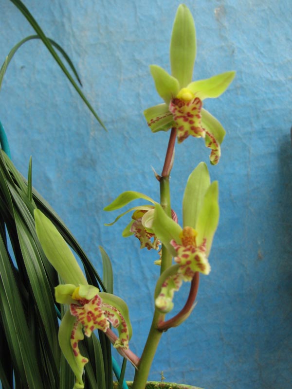 纯种蕙兰(九华兰、巴茅兰),中宽软垂叶,叶片粗糙,带齿,经脉透亮。一杆多花。色彩明艳,形态优美。浓香型。 |